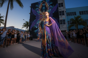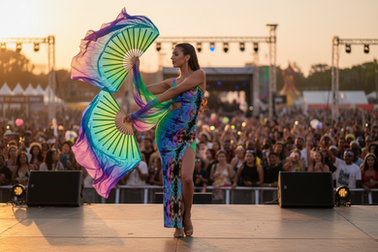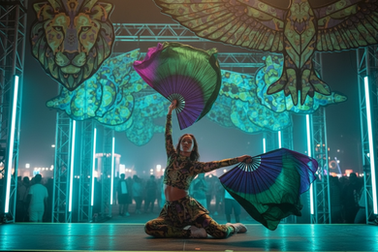 We take this tradition further by synchronizing real-time pattern generation with live music. Onstage visuals morph in response to tempo, energy, and style, while dancers wear custom outfits in the same frequency-based patterns. The result is a fully integrated audio-visual experience — one where visual identity, movement, and sound converge in real time.