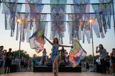 For attendees, the work becomes both a visual anchor and an emotional pause point. The motion of fabric overhead and around the body creates moments of awe, calm, and curiosity — inviting people to slow down, gather, photograph, and experience the environment more fully. As light passes through the materials, colors soften and intensify, producing a sense of openness and flow that contrasts with the density of large crowds and sound-heavy spaces.